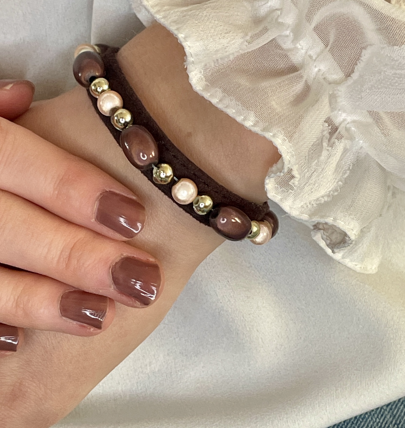 Dark chocolate strap – Rose Champagne shine beads