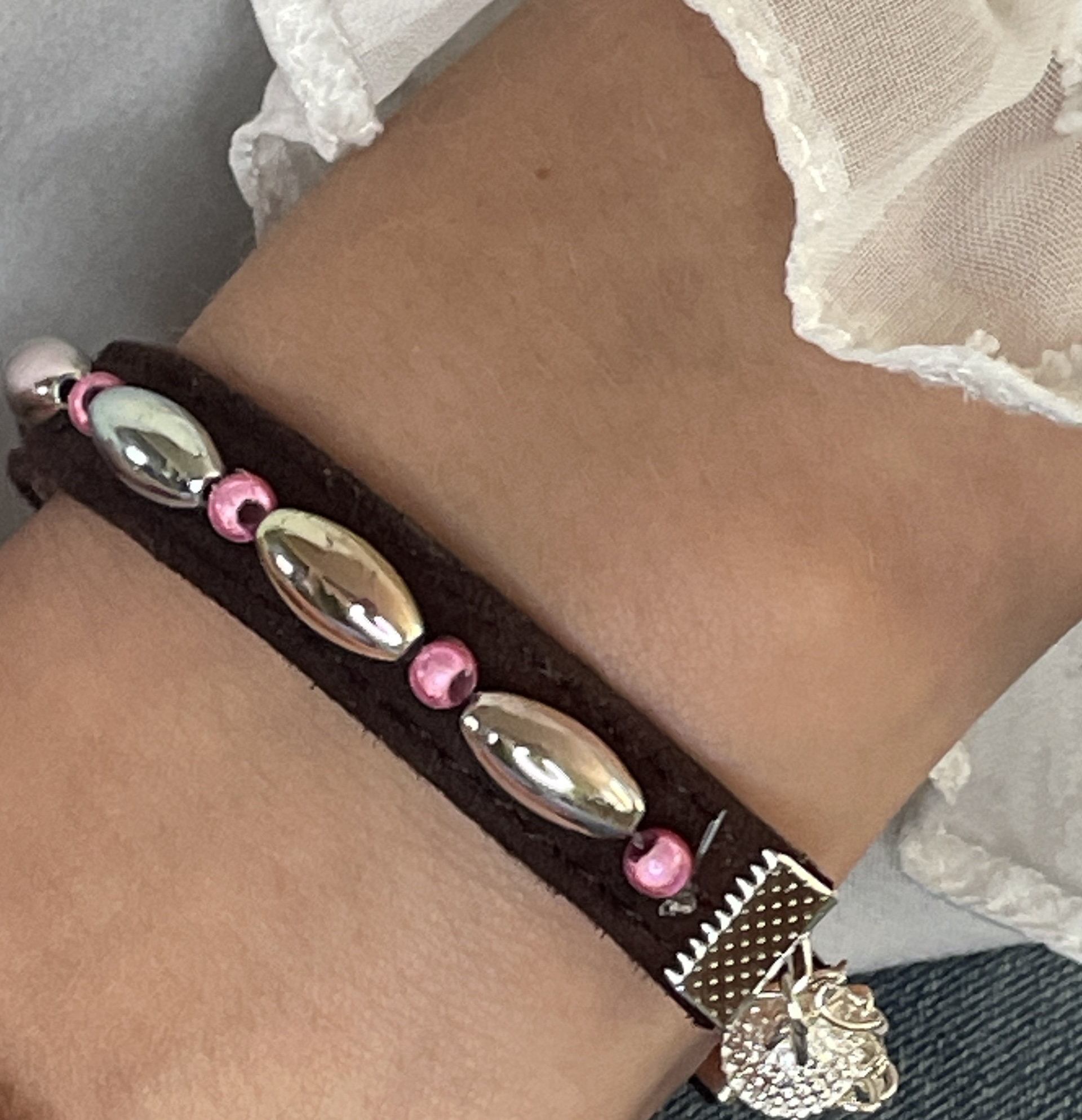 Dark Chocolate strap – Silver M O P coating Pink shine beads