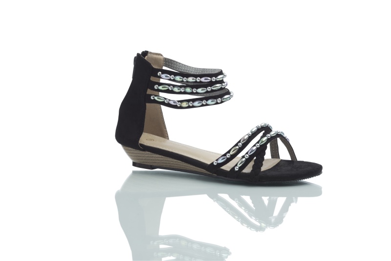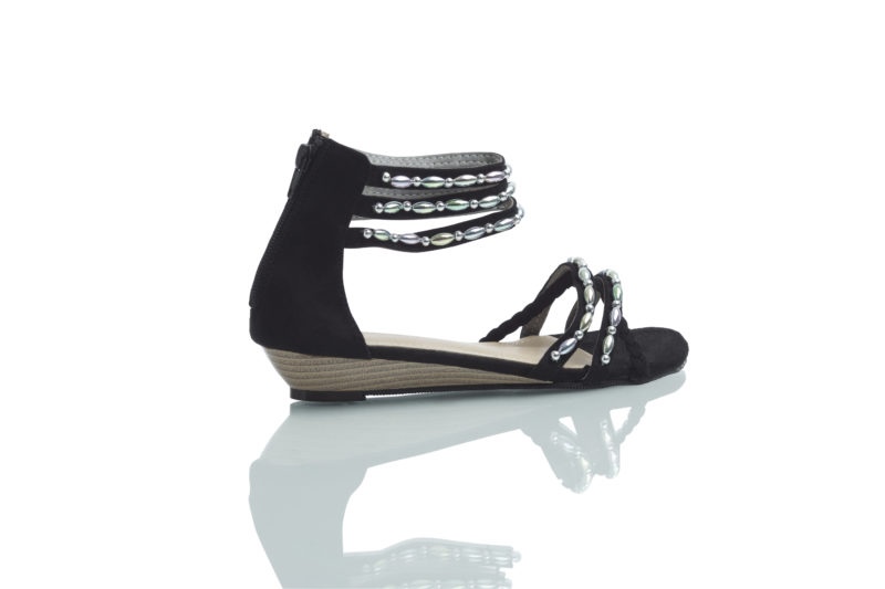 Svarta DAY i mockaimitation med 2 cm kilklack är basen på skohyllan. Hälkappa baktill med en dragkedja ger precis den stabilitet som gör DAY sköna att gå i många timmar. Pärlorna är i akryl med metallictoner som skimrar i flera olika nyanser.