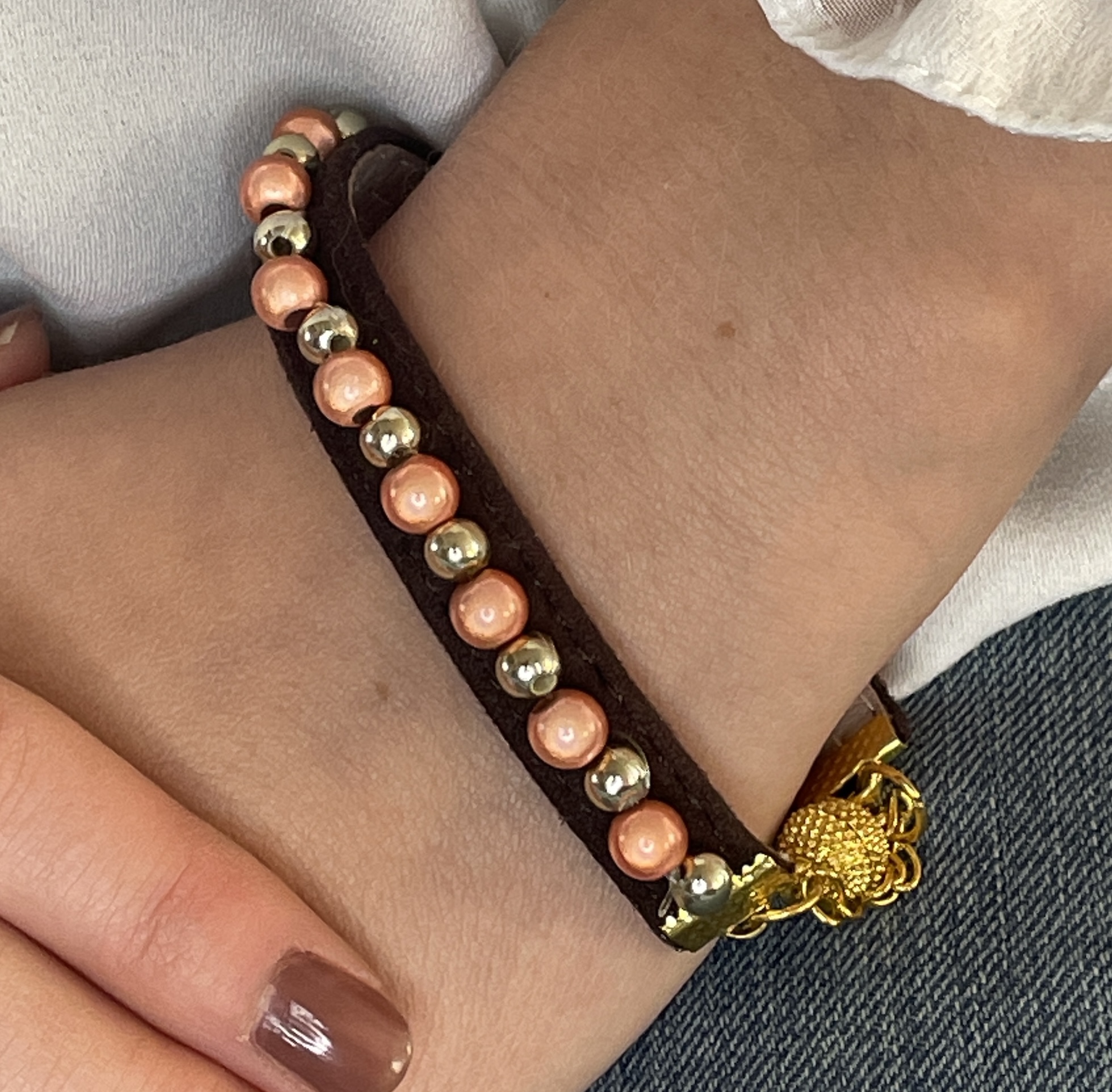 Ett klassiskt ljusbrunt band med soft honungsguldiga pärlor, så snygga att orden saknas. Det guldfärgade magnetlåset med säkerhetskedja är enkelt att hantera.