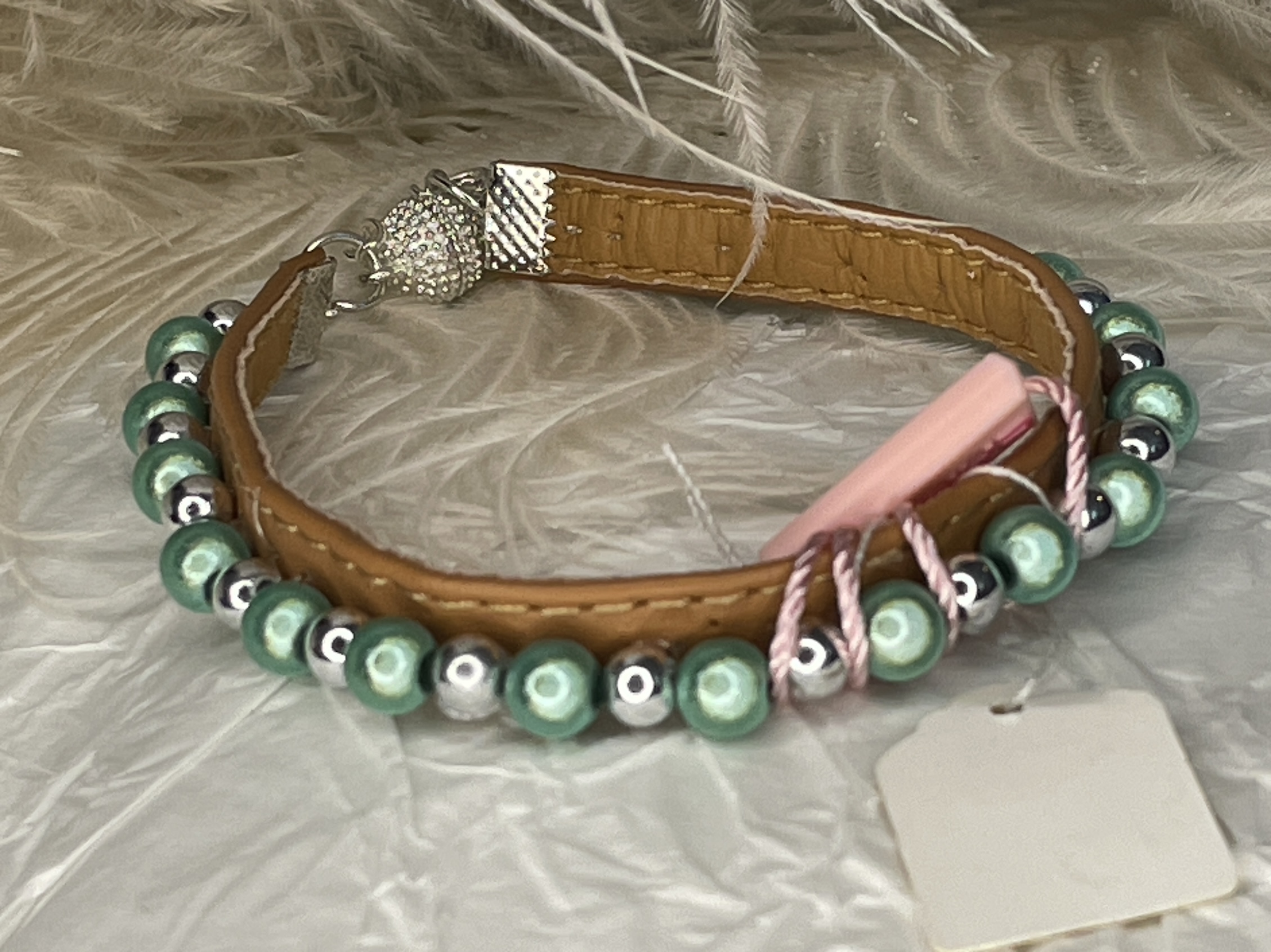 Ett klassiskt ljusbrunt band med snygga mintfärgade reflekterande pärlor. Det silverfärgade magnetlåset är enkelt att hantera.
